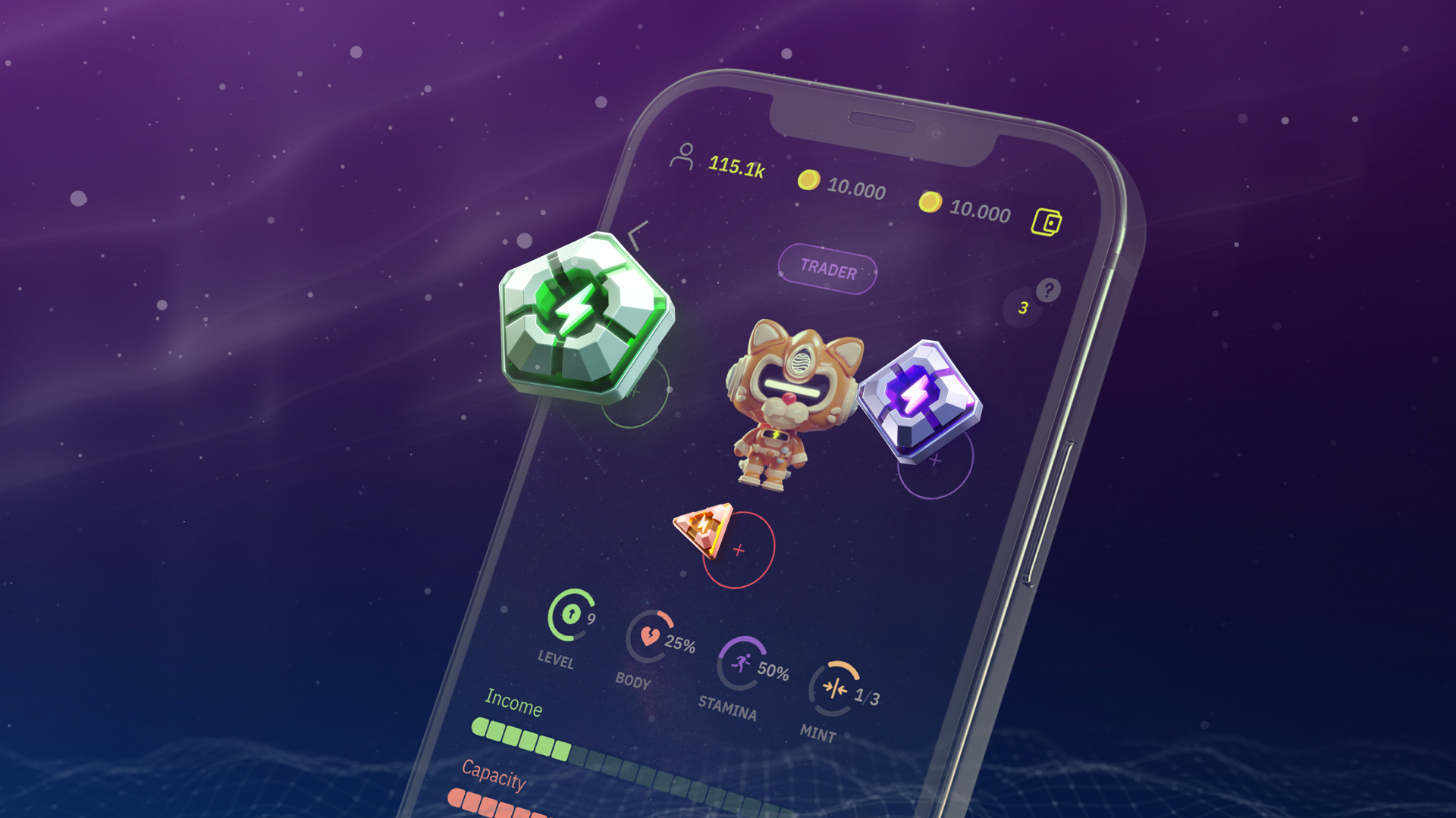 There are gems for Income (green), Durability (red) and Luck (purple). There are no gems for the Capacity indicator.